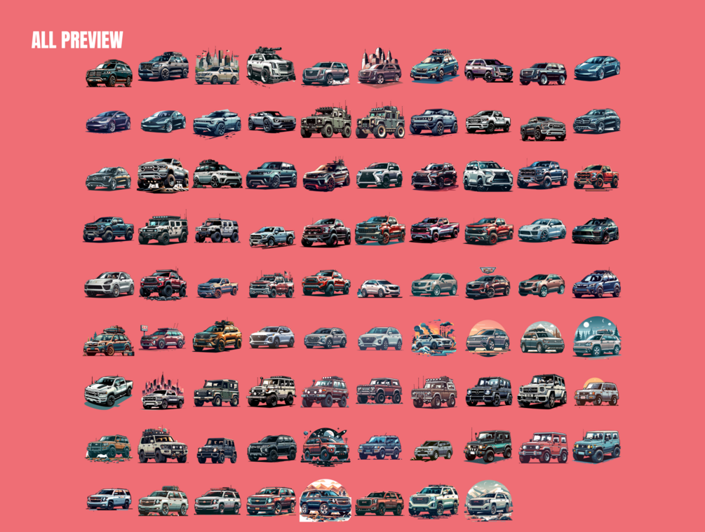 Take your designs off-road with the 4x4 Racing SVG Pack! Featuring over 88 high-quality SVG assets, this collection showcases rugged off-road vehicles, powerful SUVs, and dynamic trucks in full-color detail. Ideal for automotive projects, game designs, and branding, this pack captures the thrill and excitement of off-road racing.