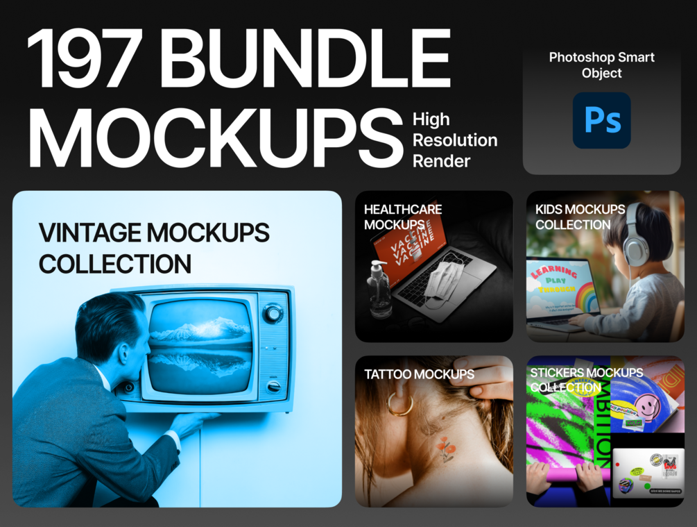 Elevate your presentations with our comprehensive bundle of 197 high-quality mockups. This bundle includes a variety of collections that will help you easily showcase your product or design across multiple industries. All mockups are fully editable using Photoshop Smart Objects, allowing you to streamline your creative process.